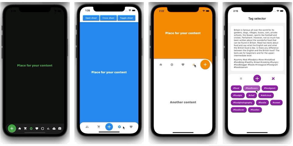 This package helps you implement a kind of combination of a bottom nav bar with a bottom sheet. You can also add a big action button as needed. It’s hard to be depicted by words. Let’s see the GIF below for more understanding: